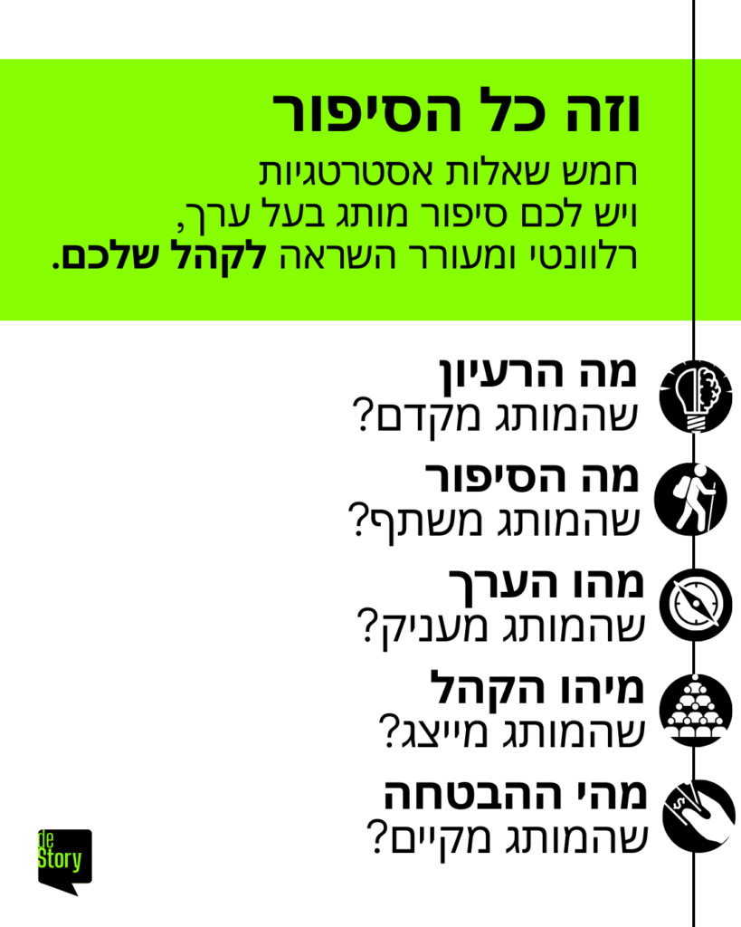 אלה חמש שאלות שיהפכו את הסיפור שלכם לסיפור מותג בעל ערך, רלוונטי, מעורר השראה ומניע לפעולה לקהל שלכם (ושלכם בלבד).